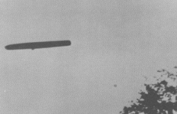 “Deze foto is genomen door Joe Ferriere op 3 juli 1967 in Cumberland, Rhode Island, New York. Het toont een groot, sigaarvormig object, waarvan hij schatte dat het 700 voet [213 meter] lang was, en rechtsonder op de foto een kleinere schijf.”